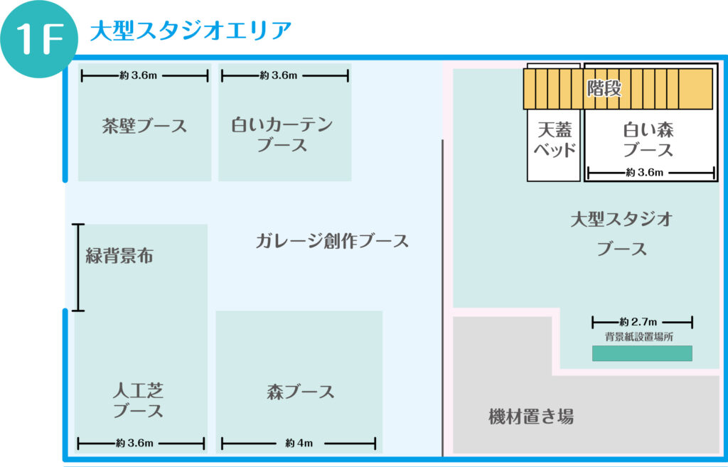 フォトスタジオYASUは、大型スタジオとハウススタジオの二つの建物が隣接しています。全部で15以上のブースで様々なシチュエーションの撮影が可能な大型スタジオです。